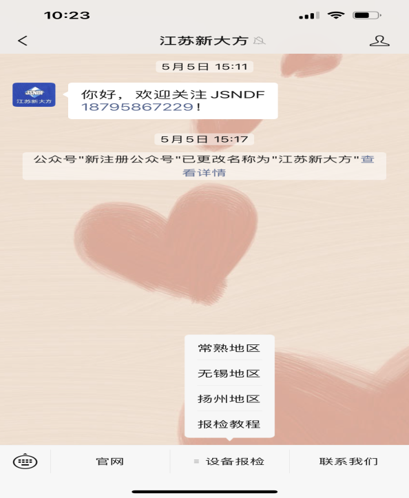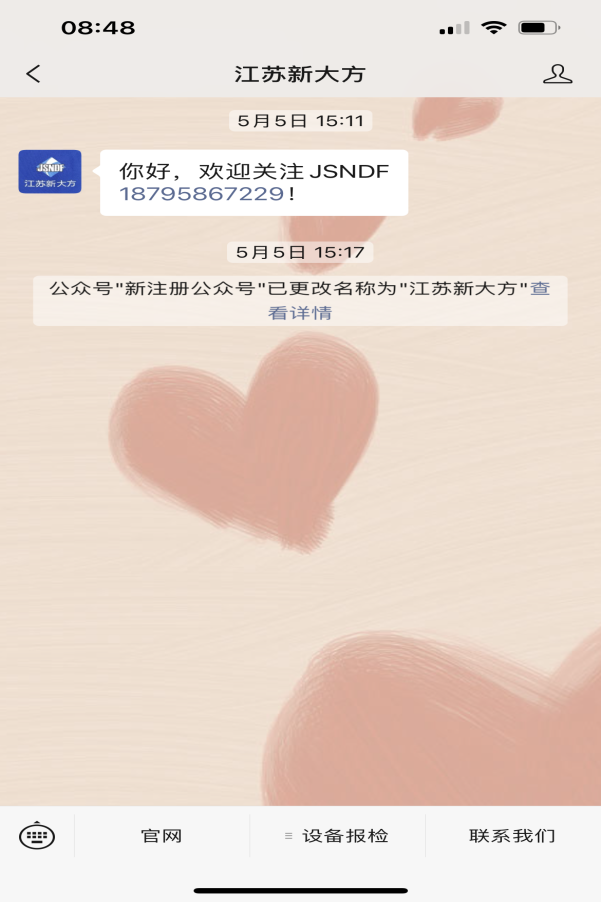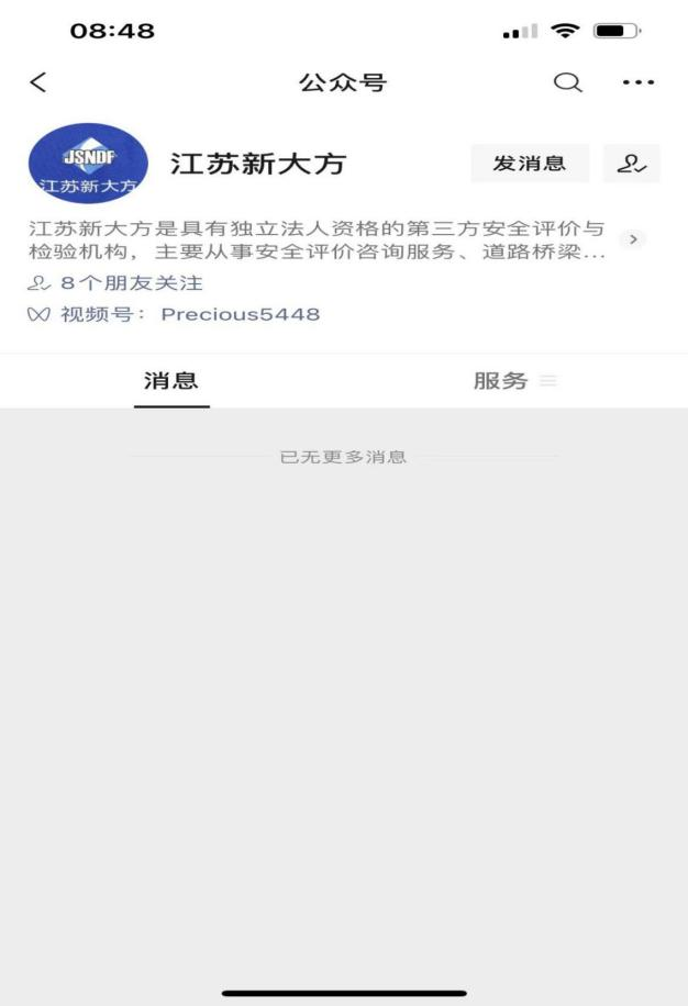 1. 微信搜索江蘇新大方,關注江蘇新大方公眾號,點擊發消息,進入主頁。